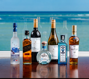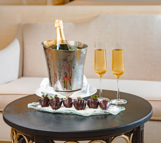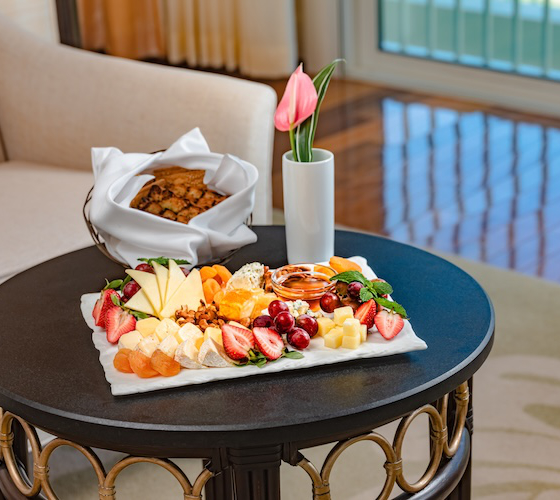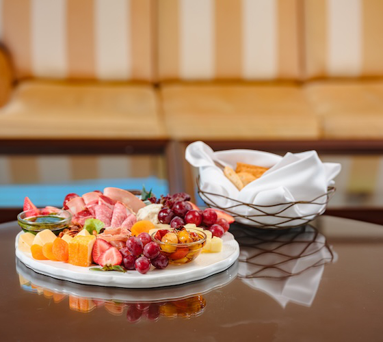 海外のチーズ、季節のフルーツ、クラッカー、ラヴァシュ、ハワイアン・スプリング・ウォーター。タルボット シャルドネ(Talbott Chardonnay)またはリッジ カベルネ ソーヴィニヨン(Ridge Cabernet Sauvignon)のいずれか。