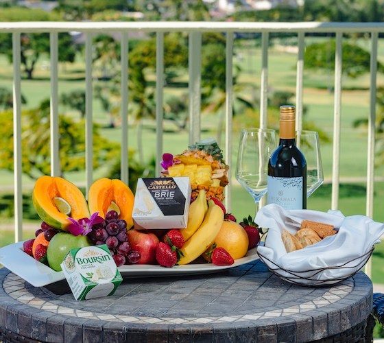 海外のチーズ、季節のフルーツ、クラッカー、ラヴァシュ、ハワイアン・スプリング・ウォーター。カハラ プライベート ラベル シャルドネまたはカハラ プライベート ラベル カベルネ ソーヴィニヨンをお選びいただけます。