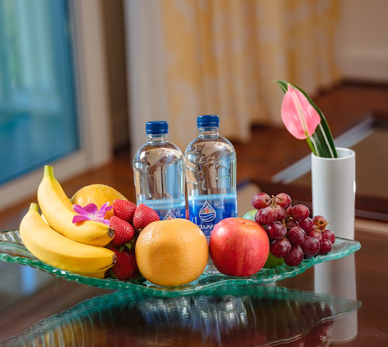季節のフルーツ各種とハワイアン・スプリング・ウォーター