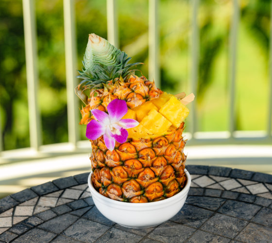 パイナップルボウルに盛り付けた、丸ごと1個をカットしたパイナップル